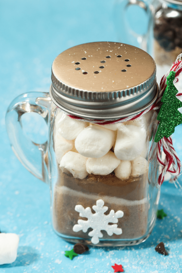 Mason Jars are perfect for giving homemade baking mixes and fun winter treats like a homemade snowman soup – just add in your hot chocolate and other ingredients layering them up in the mason jar and then attach the instructions and a cute poem along with a candy cane (or even better – a candy cane spoon) and you have a super cute present. This would be perfect for neighbours, teachers or even for you and the kids as a Christmas Eve treat.