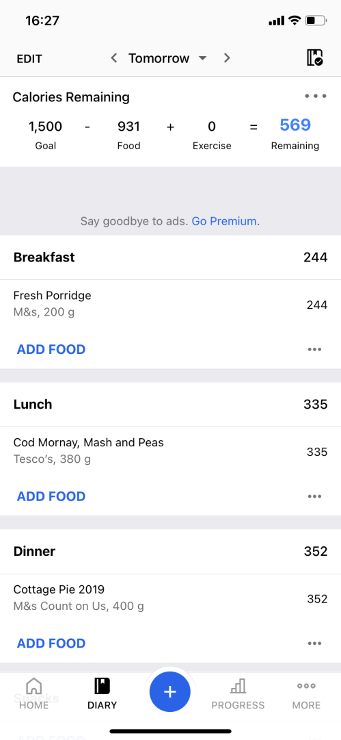 I plan the main parts of my meals in advance and pop them into the food diary and section and I go in and add anything extra that I eat with the meals along with my snacks as and when throughout the day. This is my plan for tomorrow for example…