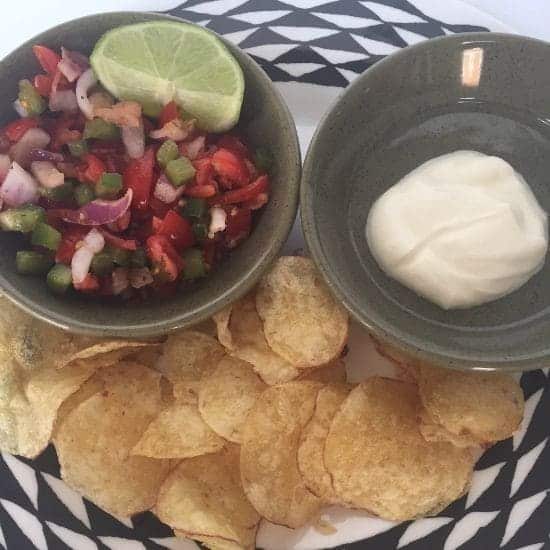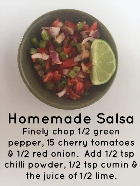 Homemade Salsa really is yummy and all you need to do to make it is finely chop 1/2 green pepper, 15 cherry tomatoes & 1/2 red onion. Add 1/2 tsp chilli powder, 1/2 tsp cumin & the juice of 1/2 lime.