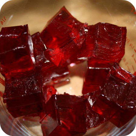 Break the jelly into cubes into a measuring jug and pour in boiling water up to the 1/4 pint level. You then need to spend ages stirring the water until the cubes have melted or you could just cheat and pop the jug in the microwave for 30 seconds – guess which is my preferred method?