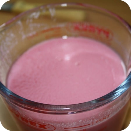 When all the cubes have dissolved into the water, I usually let it cool for twenty minutes or so before slowly adding the milk up to the 1-pint level, stirring the whole time until it’s all mixed together. If it’s too hot when you add the milk then it will curdle slightly – if you can, leave it until the mix is almost completely cool.