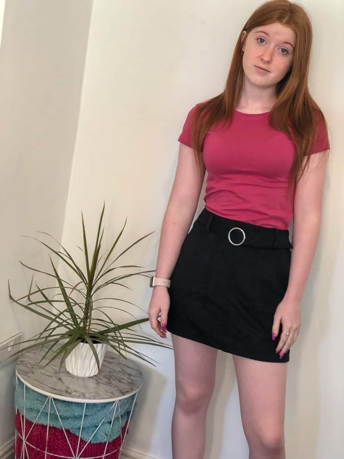 Ok, this is a Bershka black suede skirt that cost us £3.49 from Oxfam paired with a super cheap top that Miss Frugal bought herself from Primark last week when she went college wardrobe shopping. She really likes this little outfit and says she’ll definitely wear it for college with some black tights and a pair of boots. Success!