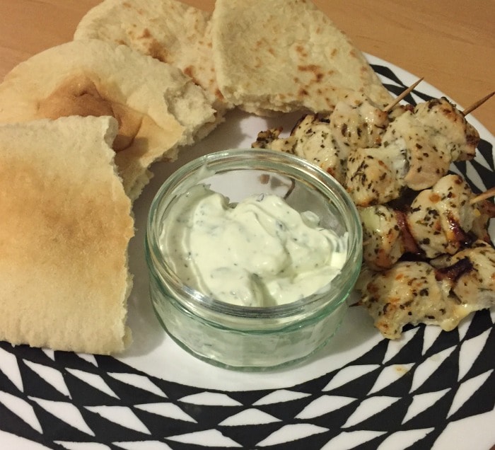 - When it’s cooked through serve with a warmed pitta bread and some yummy tzatziki.