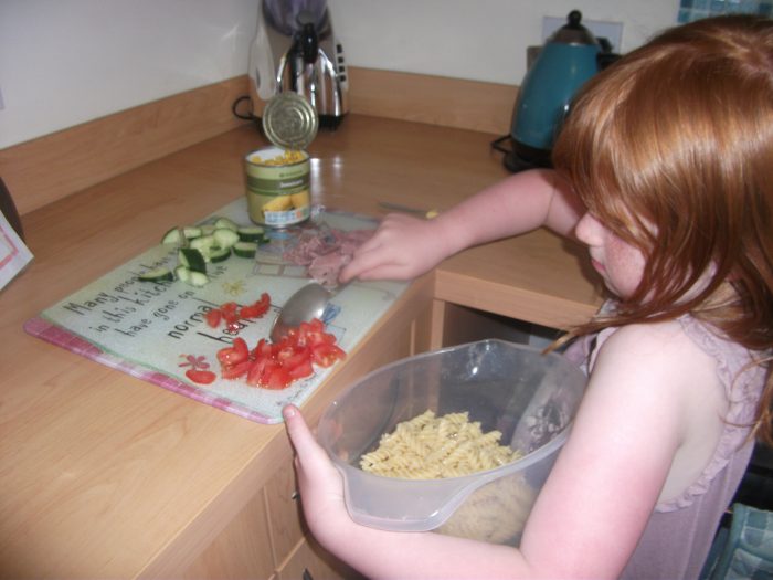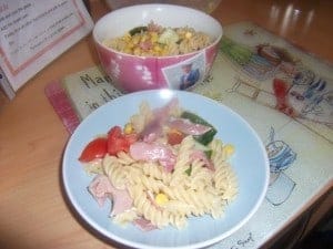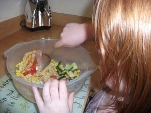Miss Frugal came home yesterday dying to try out the recipe she had learned that day in her ‘fun with food’ class at school. She’s really enjoying the classes and after her Cartwheel Sandwiches turned out to be such a success last week, I decided to let her show us how to make pasta salad by cooking it for us all for tea.