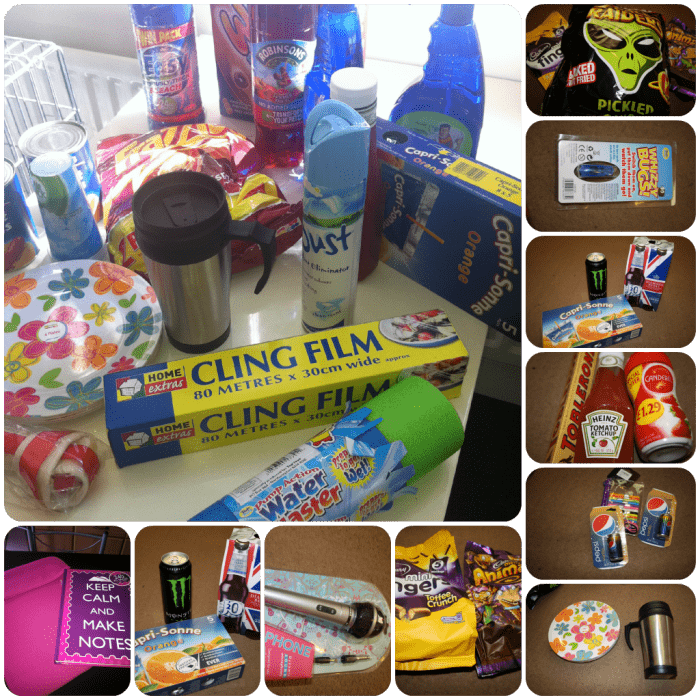 Between the three of us we bought things like an iPad cover, a microphone that Miss Frugal loves to plug in to her CD player so she can sing along with Adele, water guns, plastic plates, thermal mugs, make up, hair stuff, stationery, along with loads of cleaning products – just look at the picture above to see it all!
