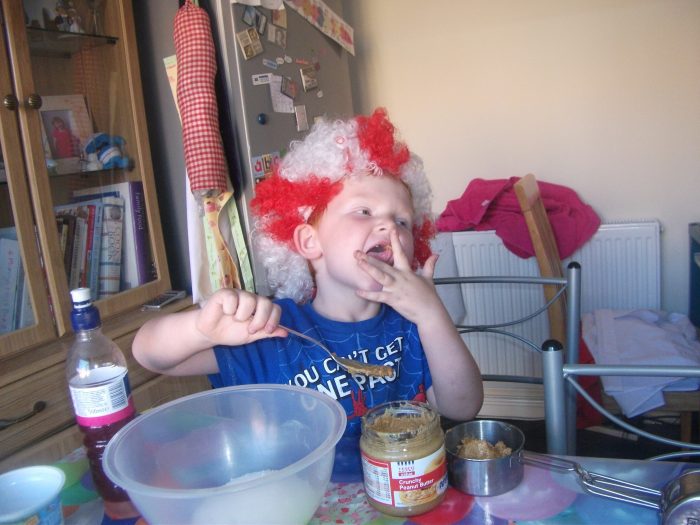 Mix them together and make blobs of the mixture on a baking tray. Cook in an oven heated to 180c for 7 – 10 minutes and hey presto, super duper, easy peasy peanut butter cookies. When you get them out they will feel a bit squidgy but that’s fine – they’ll soon harden up a bit.