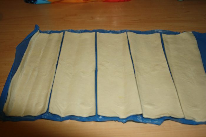 Using a sharp knife, divide the pastry into strips about the same width as a pastie.