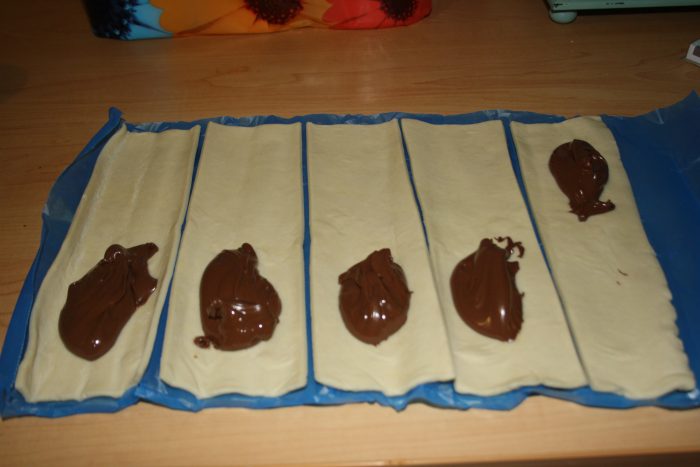 At one end put a big spoonful of Nutella, not too much though as you don’t want it to ooze out in the oven.