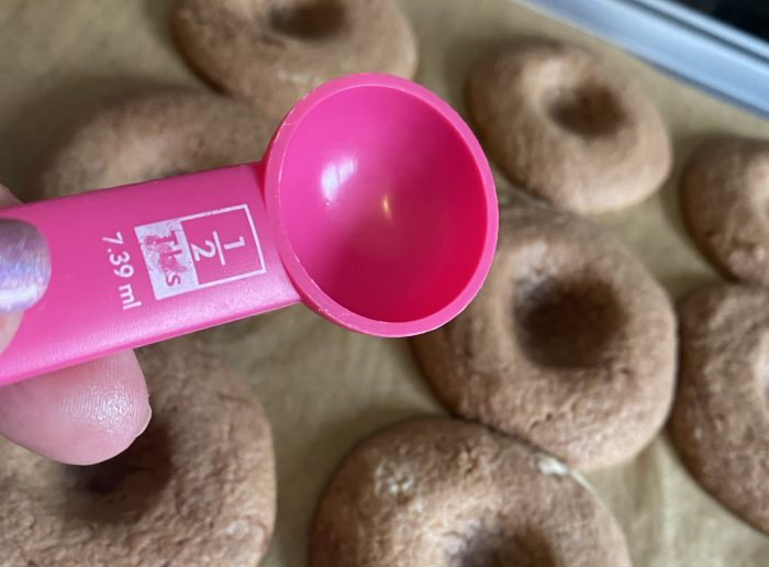 It turned out so well though so I forgave him for going rogue – it did make the mix a bit wetter so didn’t hold the thumbprint as well as the jammy versions did. That’s where I stepped in to rescue them when they came out of the oven as they’re still quite soft at that point – I used the back of a measuring spoon to press into each cookie before they started to cool and that left an even better hollow than when we used our thumbs to be fair. As they cool down they do start to take on more of a biscuit texture so you do need to do this in the couple of minutes after you take them out of the oven.