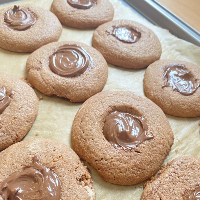 These Nutella thumbprint cookies turned out amazing although I’ll be honest, they’re not how I would have made them. I would have replaced some of the flour with cocoa like I would if I was making a chocolate sponge cake but we didn’t have any cocoa powder in so rather than wait, he decided to melt a bag of bourneville (dark) chocolate button and pop that in the mix.