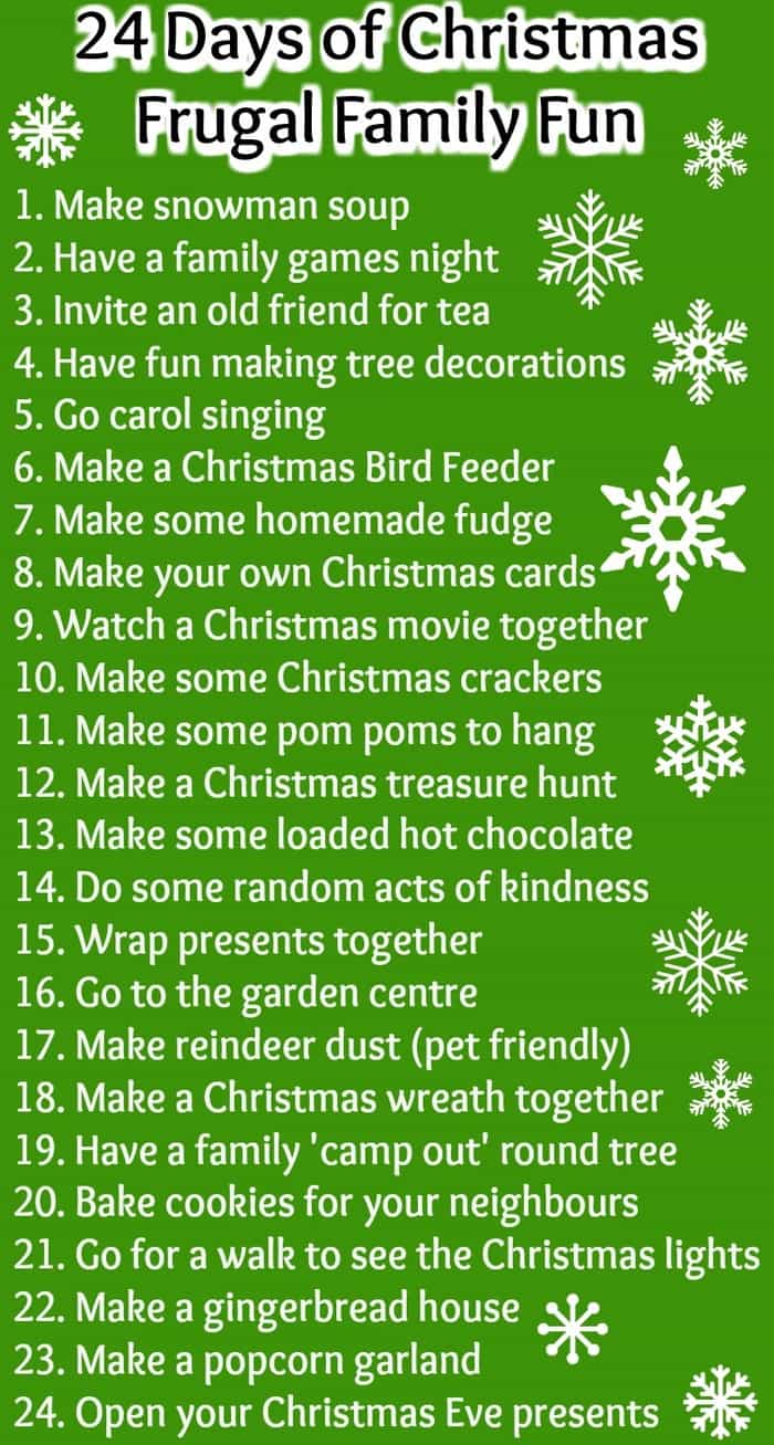 Christmas isn't just about presents (no matter what your teenager might try and tell you), it's about spending time together and having fun so today I'm sharing our 24 days or Christmas Family Frugal Fun.Life tends to get very busy for us all in the run-up to Christmas so I try to make sure that we do at least one thing together as a family every day. Last year our lovely alternative advent calendar helped us to do this but this year I'm planning something different for our advent calendars so I've written a list of 24 Days of Christmas Frugal Family Fun which we'll print out and … [Read more...]