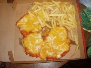 You probably won’t unless you’ve spent some time in the North East as it’s a local ‘delicacy’ round here, I’ll tell you what it is if you promise to keep an open mind as it tastes way better than it sounds. It’s a chicken escalope coated in breadcrumbs, topped with bechemal sauce and then cheese. They’re usually eaten with chips, creamed cabbage and garlic sauce and you can get them with all sorts of toppings on like mushrooms, onions, bolognaise or even doner meat.