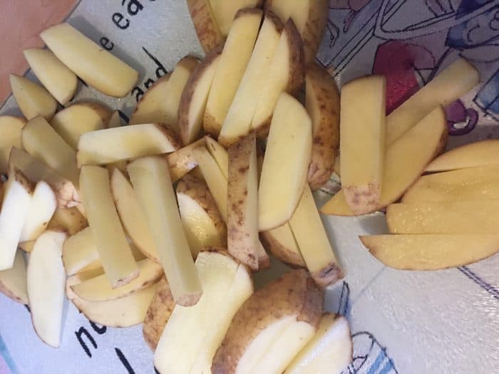 I don’t peel my potatoes when I make Slimming World chips because (a) I’m lazy, (b) they taste nicer with the skin on and (c) there’s loads of good stuff in the skin. I just give them a quick rinse under a cold tap and then cut them up into chip shapes.