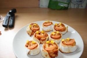 You can tel they’re ready when they’re all golden and bubbly. We let them cool for a few minutes and added sweetcorn eyes and carrot smiles (hence the name pizza smiles lol) and then scoffed the lot!