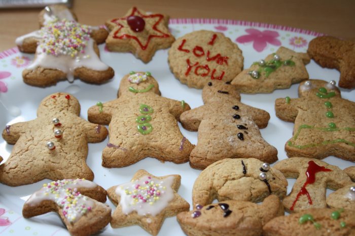 Roll out your dough to about 5mm thick and cut out your ginger persons, we used loads of other shapes as well so we have ginger hearts, ginger stars and a few ginger Christmas trees. We even cut round miss Frugal’s hand so we have a life size ginger hand.