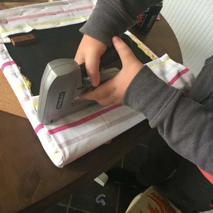 Next, I pulled the fabric as tight as possible and stapled each corner down to keep it in place. I then folded the edges over as if I was wrapping a present and let Master Frugal go wild with the staple gun (which was bought from B&Q a while ago for about £8 and has been used loads).