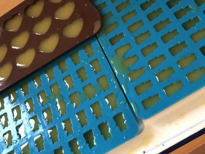 - Once all of the gummy powder is dissolved you can use your dropper to fill your moulds as quickly as possible. To do that, put the gummy bear moulds onto a baking tray to make it easier to transfer into the fridge and then using the dropper, pour the juice into the moulds.