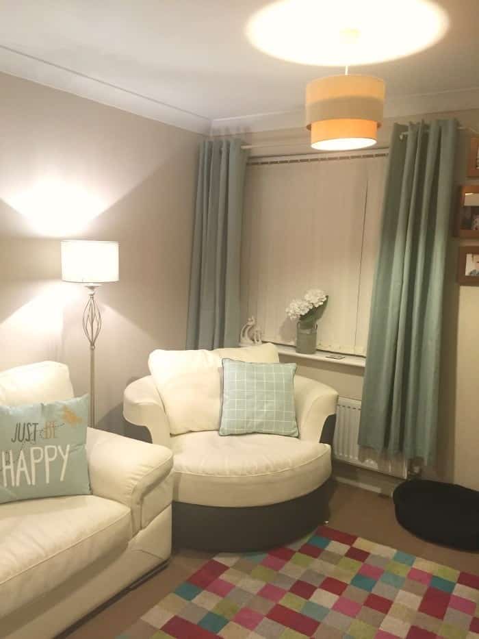 The curtains were a brilliant bargain too (or at least I think they were) because they were a third of the price of the ones I was originally looking at. I wanted the pair that matched the cushion on the cuddle chair but they were £72 which I was considering as I really thought they would bring the room together. Then I found these plain curtains in B&Q which are exactly the same shade as the cushion but just don’t have the white stitching on them. When I saw the price tag of £23 it was a no-brainer really and they look so nice hanging up.