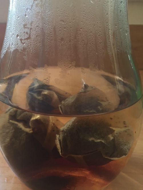 It’s really easy to make if you’ve never tried it. You basically add three tea bags into a largish jug (the better the quality of the tea bag, the better it tastes) and then pour in just boiled water to a little over your guesstimate of the half way point.