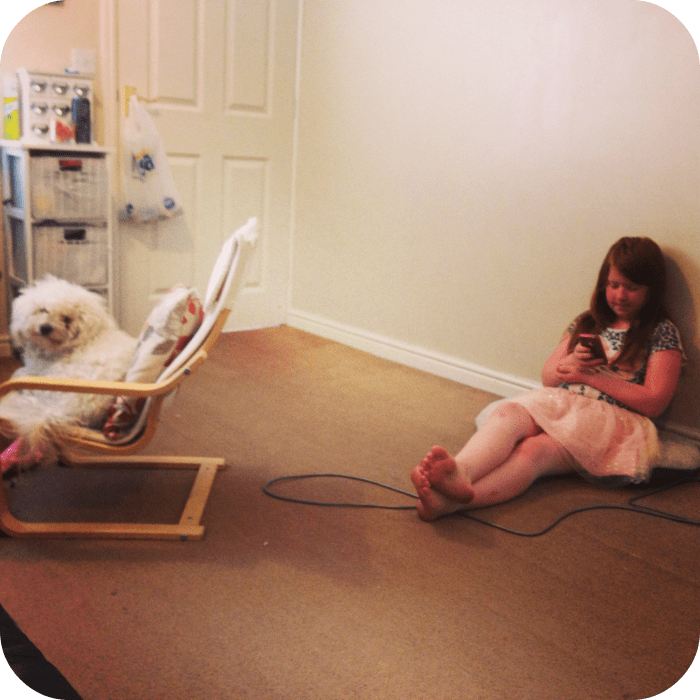 I took this photo a few months ago and I love how it shows how much our dog Buddy thinks he’s a human – he’s sat in Miss Frugal’s chair and for some reason, she’s sat on his dog bed on the floor!