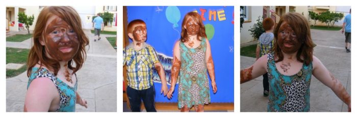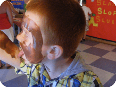 The highlight of the party is when everyone gets to lay down on the floor with their eyes closed and get painted with melted chocolate – lots of it. The lucky ones even get a squirt of chocolate squirty cream in their mouth!