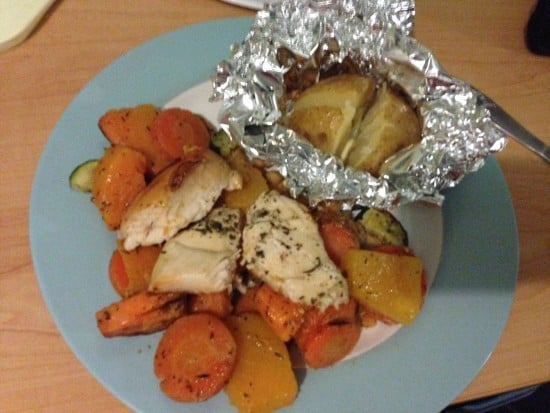 They’re so simple to make that Miss Frugal cooks them regularly when she’s cooking tea – this is one of her creations – Herby Mediterranean roasted vegetables with herby chicken. That’s my name for it anyway, she just calls it chopped vegetables with chicken!