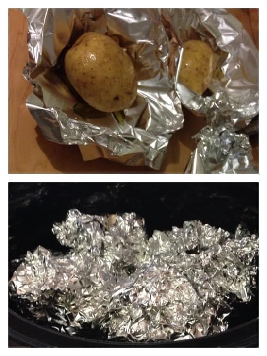 As I had enough to think about, I decided to try making the jacket potatoes in the slow cooker rather than the oven so I made each one a little wrapping out of foil, pricked it with a fork, poured over a little olive oil and sprinkled some salt on them. When I’d done that, I sealed the foil parcels up by folding the foil over and piled them all in my other slow cooker on high.