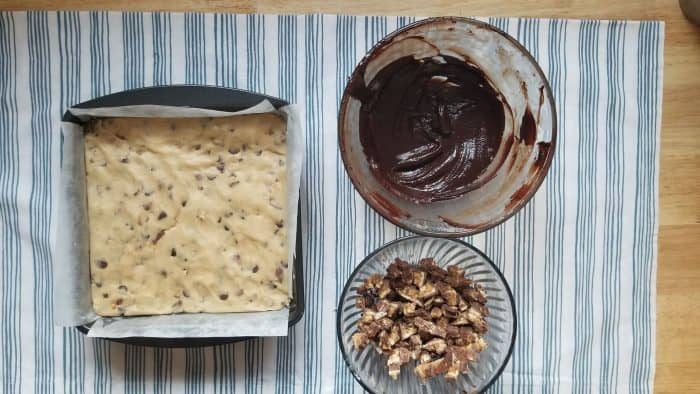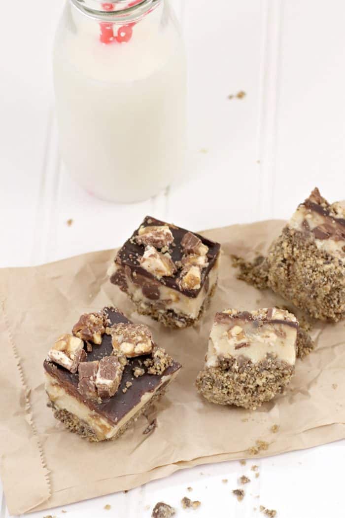 These amazing Snickers cookie dough bars are super easy to make and the kids will love them! Step 1: Add the crushed chocolate digestives to a medium mixing bowl. Mix in the melted butter and 3 tablespoons of the white sugar. Mix well. Line an 8x8 square pan (I use a silicone one which is so easy to get things out of) with parchment or wax paper and pack in FIRMLY into the pan. You may need to use the bottom of a measuring cup or glass to get a really firm base. Place in the fridge to set. Step 2: Using an electric mixer, cream together the softened butter, brown sugar, the remaining 3 tablespoons of white sugar and the salt until it's light and fluffy. Step 3: Mix in 3 tablespoons milk and vanilla. Step 4: Mix in the flour Step 5: Fold in about 75g of the chocolate chips and 2 of the chopped up Snickers. Step 6: Take the biscuit base out from the fridge and press your cookie dough mixture onto the top of the base. Step 7: Add remaining chocolate chips and 1 tablespoon of milk to a microwave-safe bowl and heat on low power until melted, checking on it frequently and stirring each time you do. It burns really easily so keep a close eye and only heat in very short blasts. Step 8: Pour melted chocolate on top of cookie dough and sprinkle over the remaining Snickers. Step 9: Refrigerate for 1 hour. Cut into 16 squares and enjoy! I cut mine into 2-inch squares but you could even make them smaller so they're more bite-size than bar size.