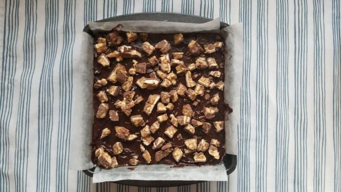 I feel like you could experiment loads with different chocolate bars here, I went with Snickers as they were on offer 3 for £1.20 but I can see all sorts working with this recipe. I bet Maltesers would be amazing and even a Cadbury’s Creme Egg would be super nice if you ask me.