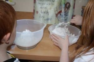 When you have your mixing bowl filled with snow, pop it in the freezer while you prepare the rest of your ingredients although it’s pretty simple so it won’t take long at all. You’ll notice that I don’t give an exact measurement for the snow here – we just filled a good sized mixing bowl and even then we ended up going back out to get some more to top it up.