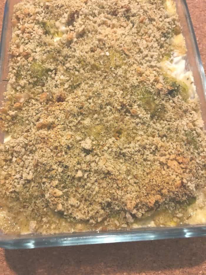 - Sprinkle the breadcrumbs evenly over the top and then bake in the oven at about 180 c until the cream is bubbling – mine took around 15 minutes.