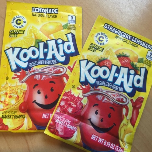 We have a shop near us that sells American sweets and a couple of weeks ago, there was much excitement from the kids (and maybe me) when they started to stock Kool Aid drinks sachets. They weren’t expensive so we stocked up on some flavours thinking we’d be back for more in no time – we bought strawberry lemonade, grape, pineapple, lemonade and one I can’t remember the flavour of but I know it was bright green when we made it up.