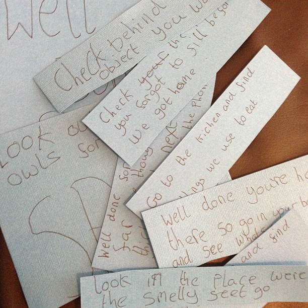 Today we’ve been making a treasure hunt for Mr Frugal when he comes in from work and it took me back to the ones we used to do for the kid when they were younger. We haven’t done one for ages though so we thought it was time to sort that out! We’re starting with one for Mr Frugal – mainly because he’s not in at the minute so clue writing and hiding is much easier but also because we haven’t seen him in a week as we’ve been away so the kids wanted to do something for him as a surprise.