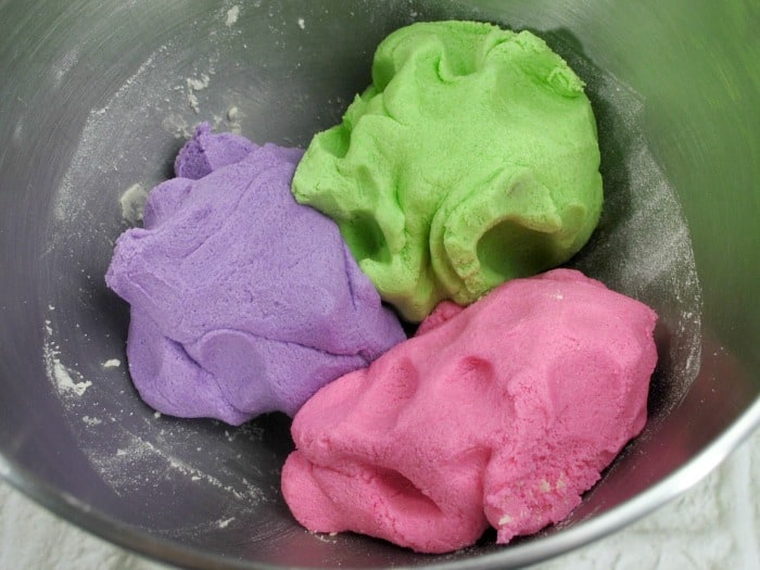 - Divide the dough into 3 portions and add a food coloring color into each bowl. Pink in one bowl, purple in the second bowl and green in the third bowl and mix each one until combined