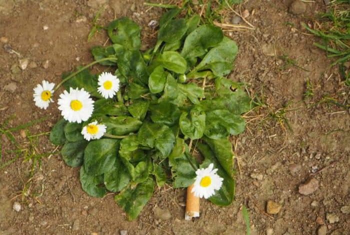 He was fascinated by the fact that these pretty daisies had an ugly cigarette butt just carelessly thrown down next to them.