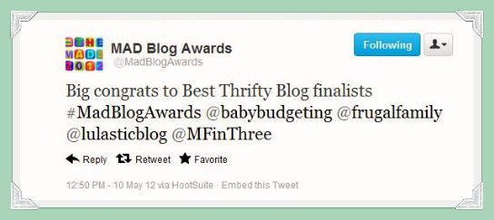Well on Thursday, I was on the way home from work on a busy train when my phone bleeped to tell me I’d been mentioned in a tweet. The tweet in question was from @MadBlogAwards to tell me I was one of the finalists in the Best Thrifty Blog category!