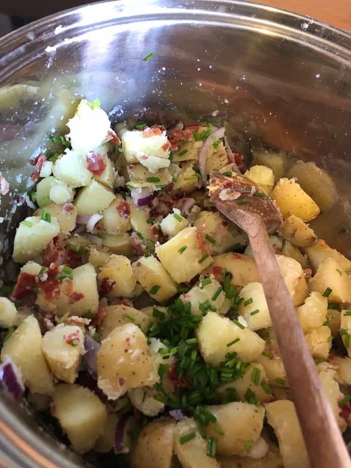 This amazing potato salad is going to be your go-to recipe for the rest of the Summer and beyond, and not only that – it’s going to make you look like a Domestic Goddess (or god) so if I were you, I would absolutely bookmark or Pin this recipe because you’re going to want to come back to it again and again.