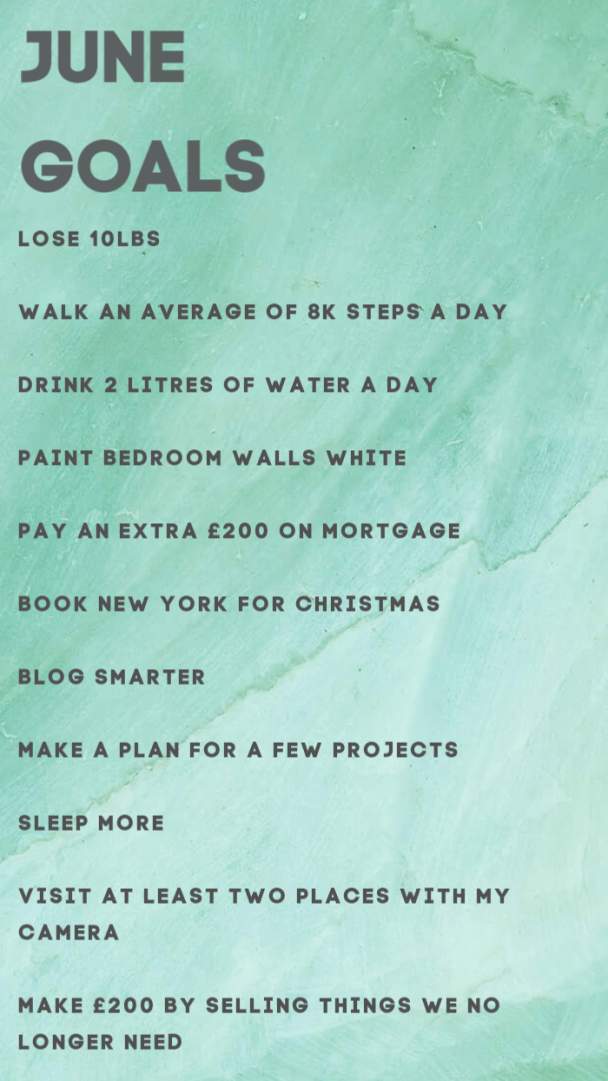 I’m definitely going to be carrying my weight loss goals over to my June goals and I’m also adding in some more ‘me’ related goals and a couple of blogging ones.