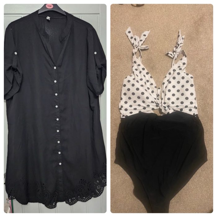 A super lightweight dress that doubles a a swimsuit cover up for £3 and a brand new with tags swimsuit for £7.50. They look really good together and I feel comfortable in them which is the important thing (to me).