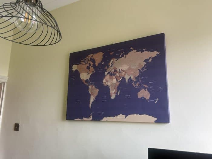 The opposite wall to this one is painted in a sage green and I bought the world outline from Vinted for £8 and it looks amazing but it’s not as big as I thought it would be if I’m honest.