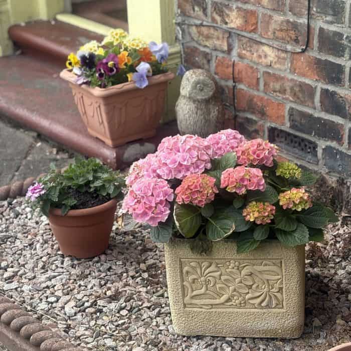 The big stone planter that our hydrangea bush is in was at the end of the garden covered in green moss and filled with soggy mud. We emptied it out and gave it a good clean and just look how amazing it looks!