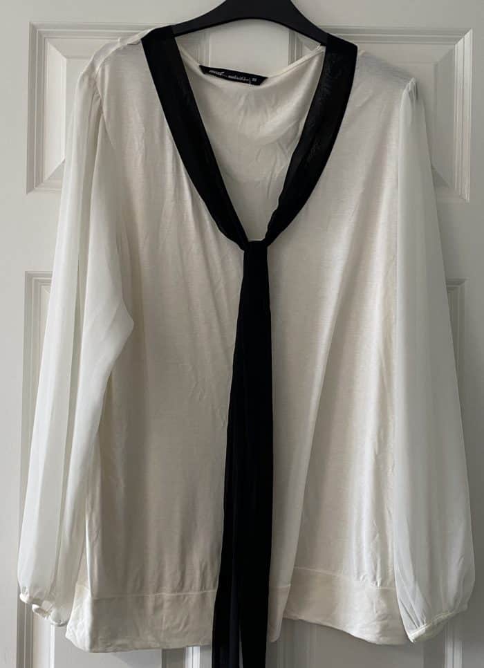 I love this pretty little Next top that I found for just £3.99, it’s got chiffon floaty sleeves and a contrasting black detail which just looks fab if you ask me. It’s a couple of sizes too big but I loved it so seeing as it was only £2.99, I bought it thinking I could find a way to make it work and I was right. Because it is that bit too big it actually sits quite long which means I’ll be comfortable wearing it with just a pair of black leggings – if I’d bought it in my normal size then it would have sat too high to cover my tummy so I would have been forever pulling it down.
