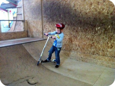 How he went from the tiny ramp to the ten foot one in the space of fifteen minutes, I have no idea but he didn’t hear me shout and I couldn’t get to him quick enough to stop him, so down he came…. He managed to stay on his scooter all the way to the bottom of the ramp, he even managed to stay on it as he zoomed across the floor at the bottom of the ramp and he even managed not to get hit by all the scooters and BMX Bikes that he was cutting up as he zoomed along, so scared that he just forgot to brake but he didn’t managed to stay on when he hit the side of another ramp and he ended up in a heap on the floor about fifty feet from the ramp he’d just been down.