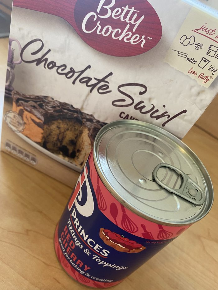 I decided to go with a tin of black cherries and a chocolate swirl cake mix although there was no swirl as I just popped all the mix into the bowl at once but it turned really nice anyway – very Black Forest Gateau-esque.