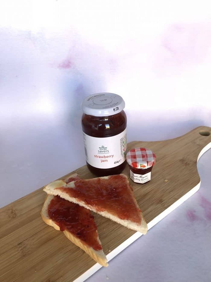 We’re not huge jam eaters here so to compare the Morrisons savers strawberry jam we decided to buy a single-serve sized jar of Bonne Maman strawberry jam so we didn’t waste it – even that teeny jar cost more than the savers jar though!