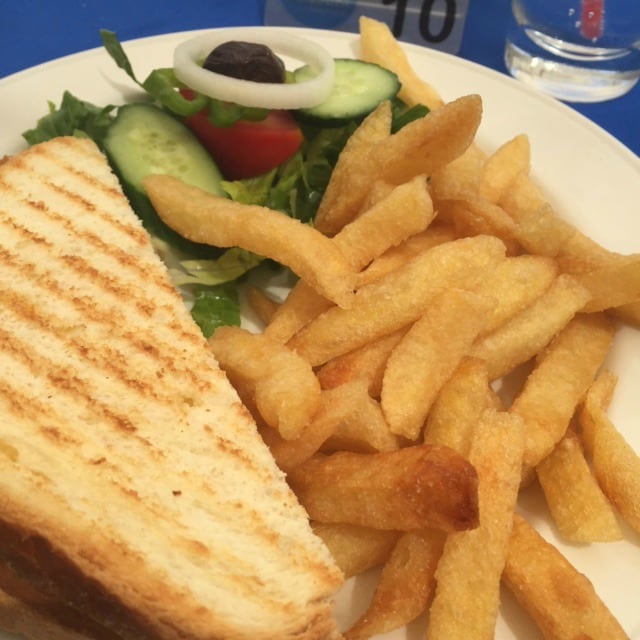 There’s a pool bar where you can get drinks, slushies and ice cream from through the day (all included in the all inclusive) and also the Bikini bar which you can just make out in the top left of the photo. The Bikini bar is separated from the beach by a boardwalk about two metres wide and serves the buffet lunch and the snacks throughout the day. As part of the all inclusive package at the Vrissaki Beach Hotel you can get cheeseburger and chips, various pasta dishes, a salad or our personal favourite – a ham and cheese toastie.