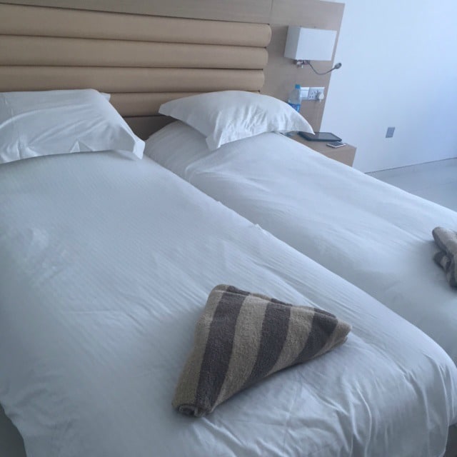 The room itself was amazing (I may use that word a lot in this post) and was about double the size of some hotel rooms that we’ve stayed in previously. There was a dressing gown and a pair of slippers each in the wardrobe waiting for us and a beach towel each on the end of the beds. The room itself had two beds, a small table and chairs, a TV, a hairdryer, a fridge and a safe as well as tea and coffee making facilities and lots and lots of storage space in the huge wardrobe (you had to leave a deposit at reception to use the fridge and the safe I believe). You can also hire an iron as well but we didn’t bother so I’m not sure how much it was.