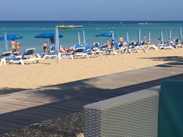 You can see from the above photo what the pool area at the Vrissaki Beach Hotel looks like but the picture doesn’t show you just how clean it is – there is someone tidying up all the time and there was never any mess the whole time we were there. There is one umbrella for every two sunbeds and for a 5 Euro deposit you can actually reserve the sunbeds you want for the whole time you’re there!