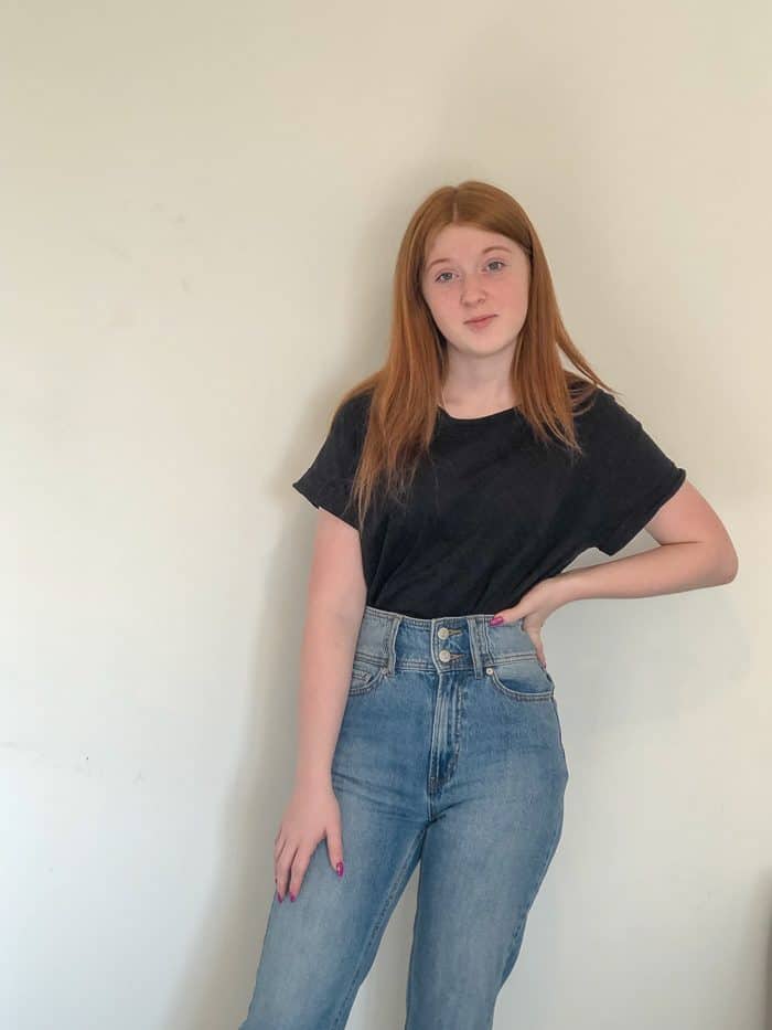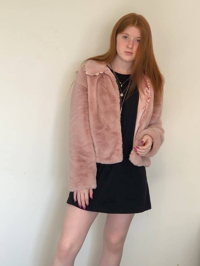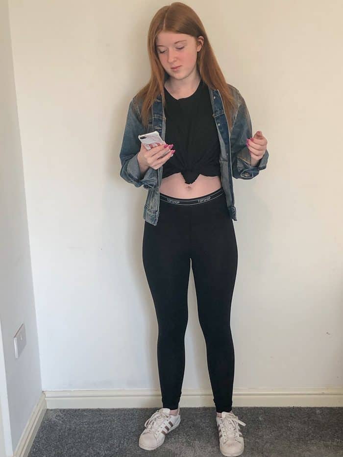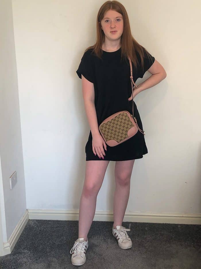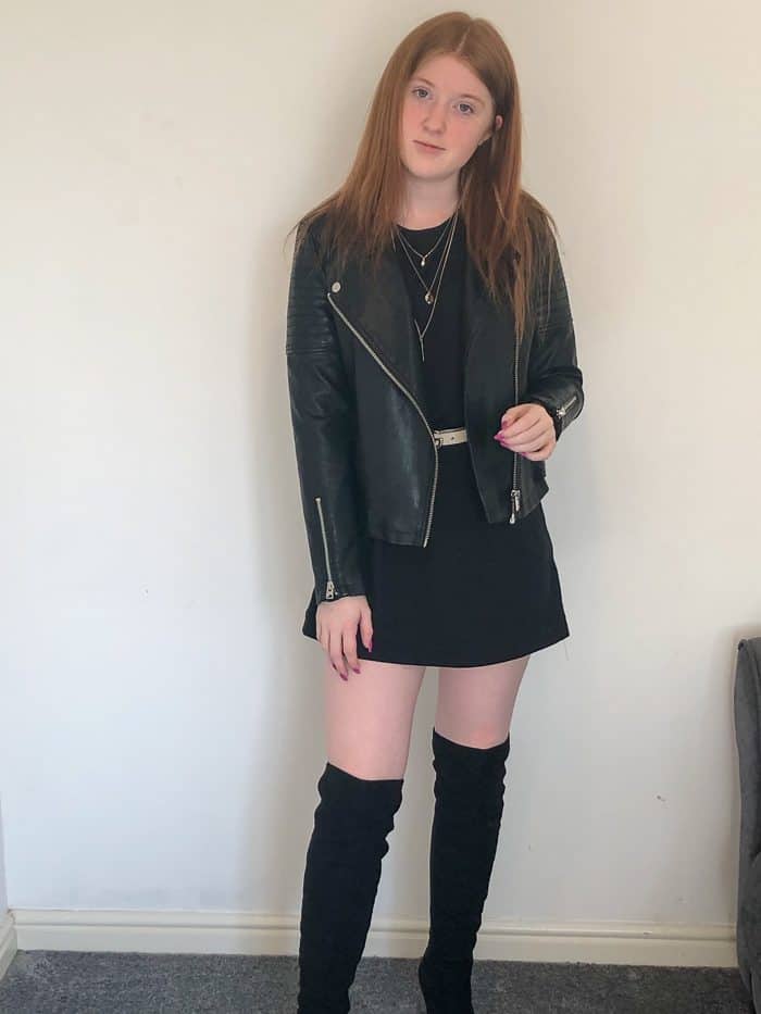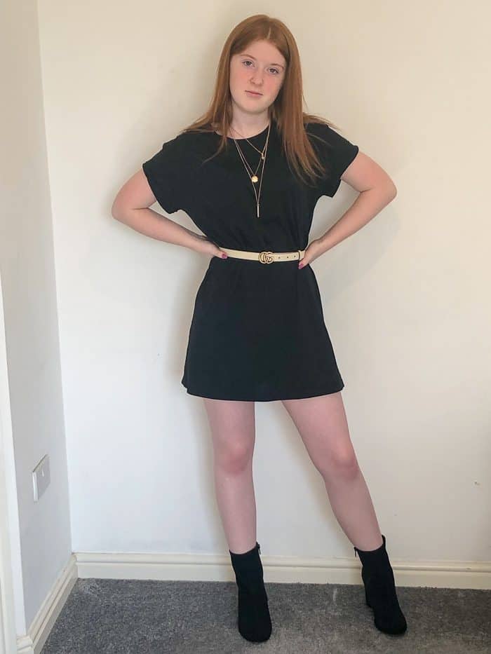 The t-shirt she’s using today is a H&M oversized black t-shirt which is the perfect length as it’s just long enough to pass as a dress as well as be worn as a t-shirt. The best thing about it for me is that it cost just 99p from the sale rack in the Age UK charity shop.