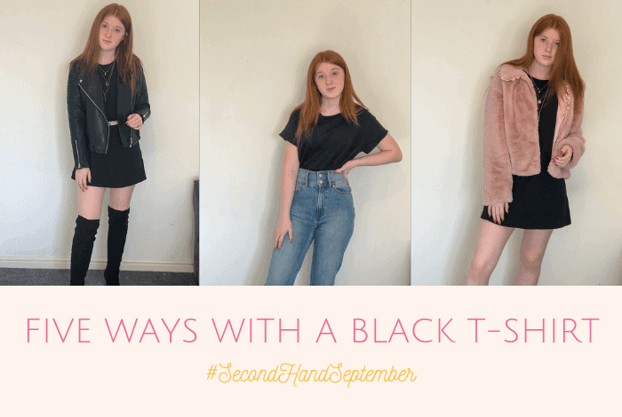You probably know by now that we’re joining in with #SecondHandSeptember this month. 😉 Last week I mentioned in our mini charity shop haul that we’d found a bargain 99p t-shirt and today, I’ve enlisted the help of Miss Frugal who’s volunteered to show us all the different ways you can style the t-shirt so it’s perfect for all occasions.